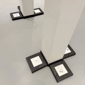 The fourth part is presented by four objects with hidden questions and answers of the women while seeing the reflection of themself or the observer in the mirror while passing by. The hidden questions and answers are possible to see only when the viewer is directly tilted above the object. At that point, herself or himself is the part of the installation. Punctation marks communicate the meaning and can be easily switched as the opposite (depends on the point of view): !? :— explanation by not completing “yes”/“no” ()… explanation by moment of silence