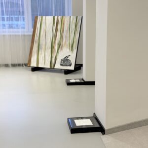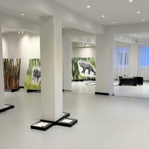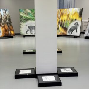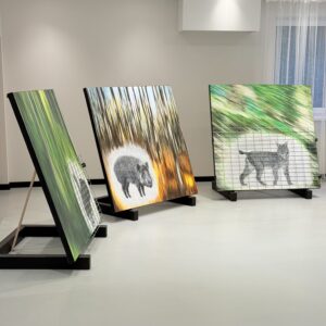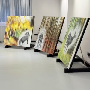 The animals are painted in a contrasting style – black and white, partly dreamlike, as if they no longer belonged in the colorful world around them. A similar principle is used in the photographs, which the artist edited to enhance the impression that these creatures are slowly disappearing from our world, the world slowly fading away. The fox, which we still occasionally see, may one day become only a memory – an animal that no longer exists. Thus, the exhibition is not only about the beauty of nature but also about its fragility and the responsibility we all bear.