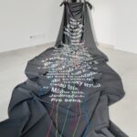 The fifth part is a statue holding a poem titled The Mirror, embroidered with colorful wools representing a connection to all women, as well as the women who are the subjects of this series. The wools climb up the statue, intertwining with single words until they reach the hands, where some continue wrapping around the forearms. This part amplifies the effect of a strong hold of the life itself. The wools create an impression of coloring the entire scene. The statue itself has a non specific but the mirror face which drag in all approaching persons.